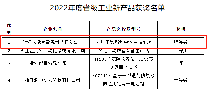 近日,浙江省长兴县经济和信息化局公示了2022年度省级工业新产品获奖名单,由浙江3522vip浦京集团氢能源科技有限公司研发生产的大功率氢燃料电池电堆系统获得全县唯一省级特等奖。